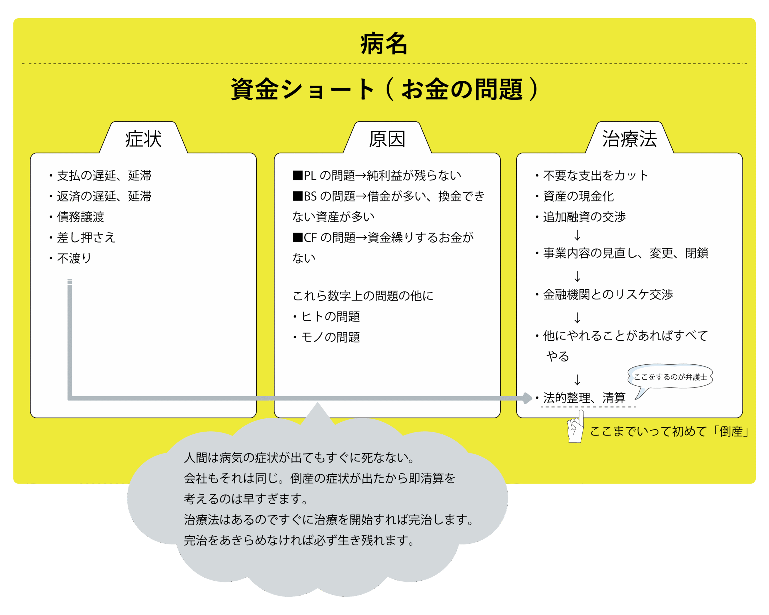 ここでは3つある倒産の原因とそれぞれの治療法を説明します。