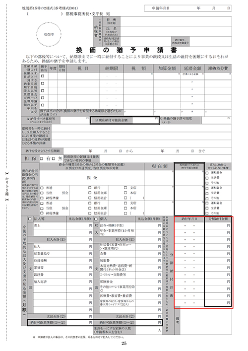 - 分割払いなどの分納交渉に税務署に応じてもらう条件として、「換価の猶予 申請書」「納税の猶予 申請書」などの書類を提出することが必要