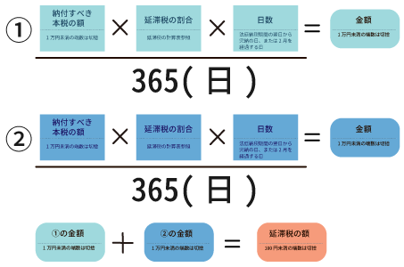 納付すべき本税の額×延滞税の割合×日数(2月を経過する日の翌日から完納の日)÷365日=②の金額