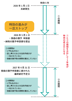 - 時効の進みは「換価の猶予 申請書」などの書類の提出、差し押さえなどの手続きでストップする